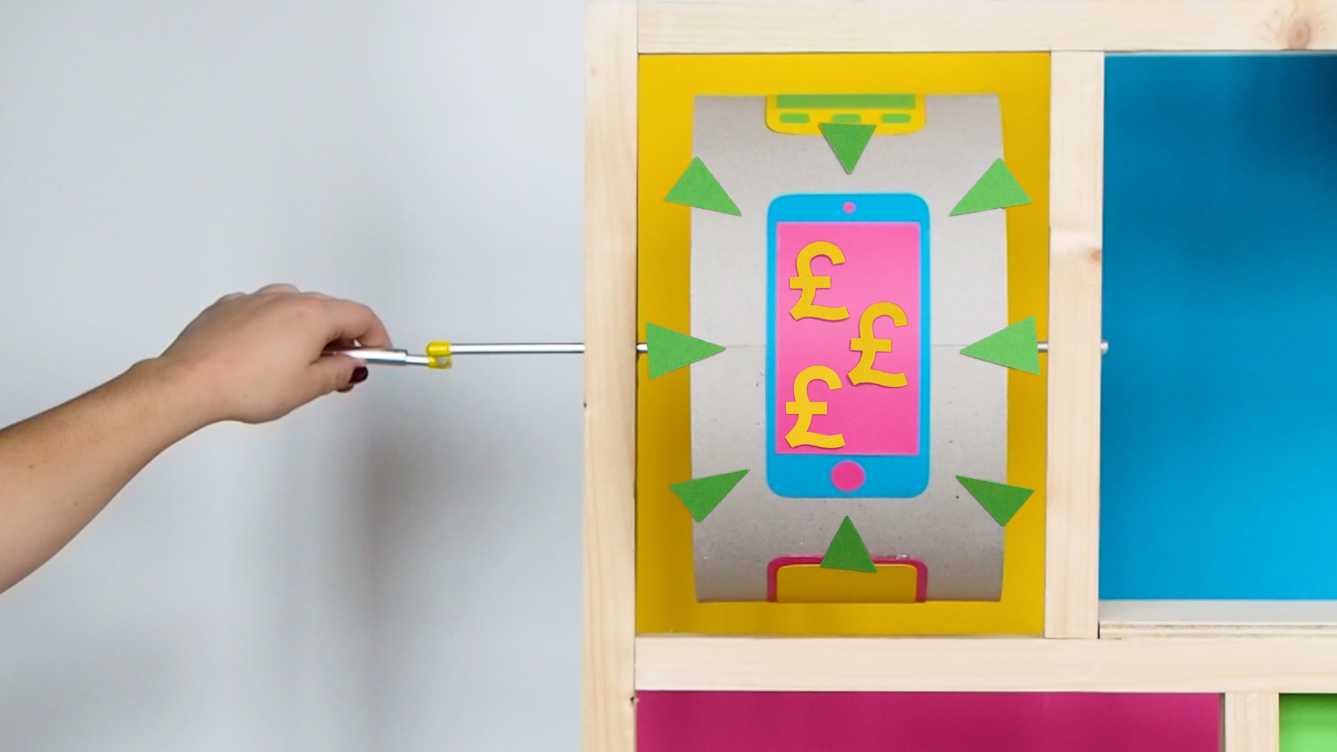 In a wood and paper installation, the four steps are shown as fictional and playful actions which represent the actual steps of recycling your phone with giffgaff.
