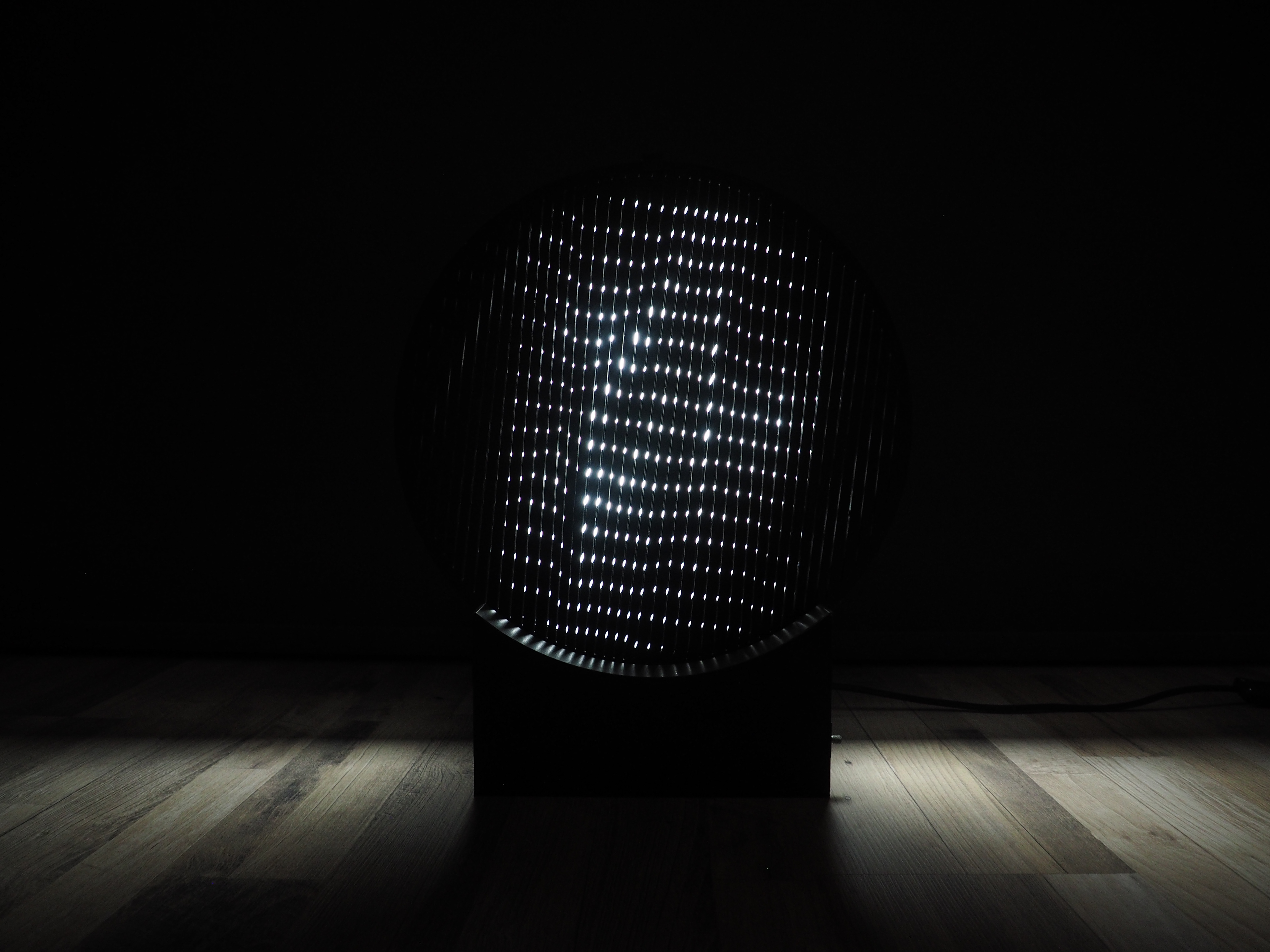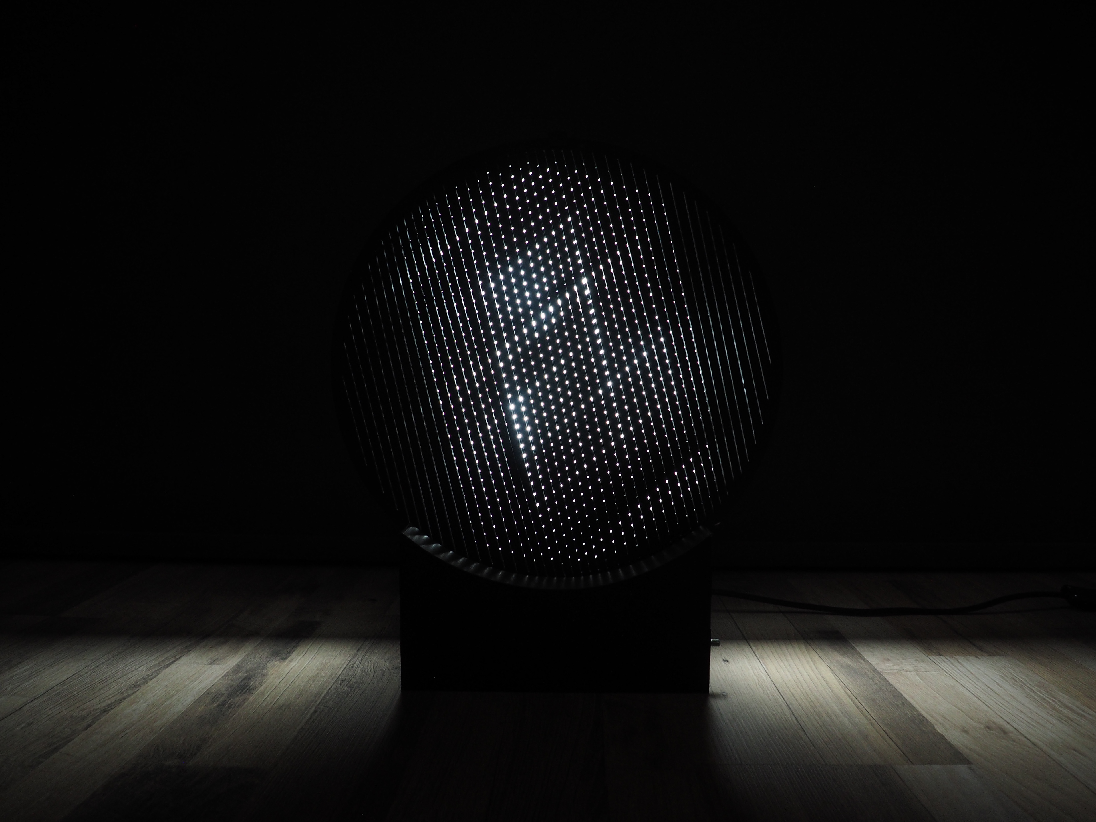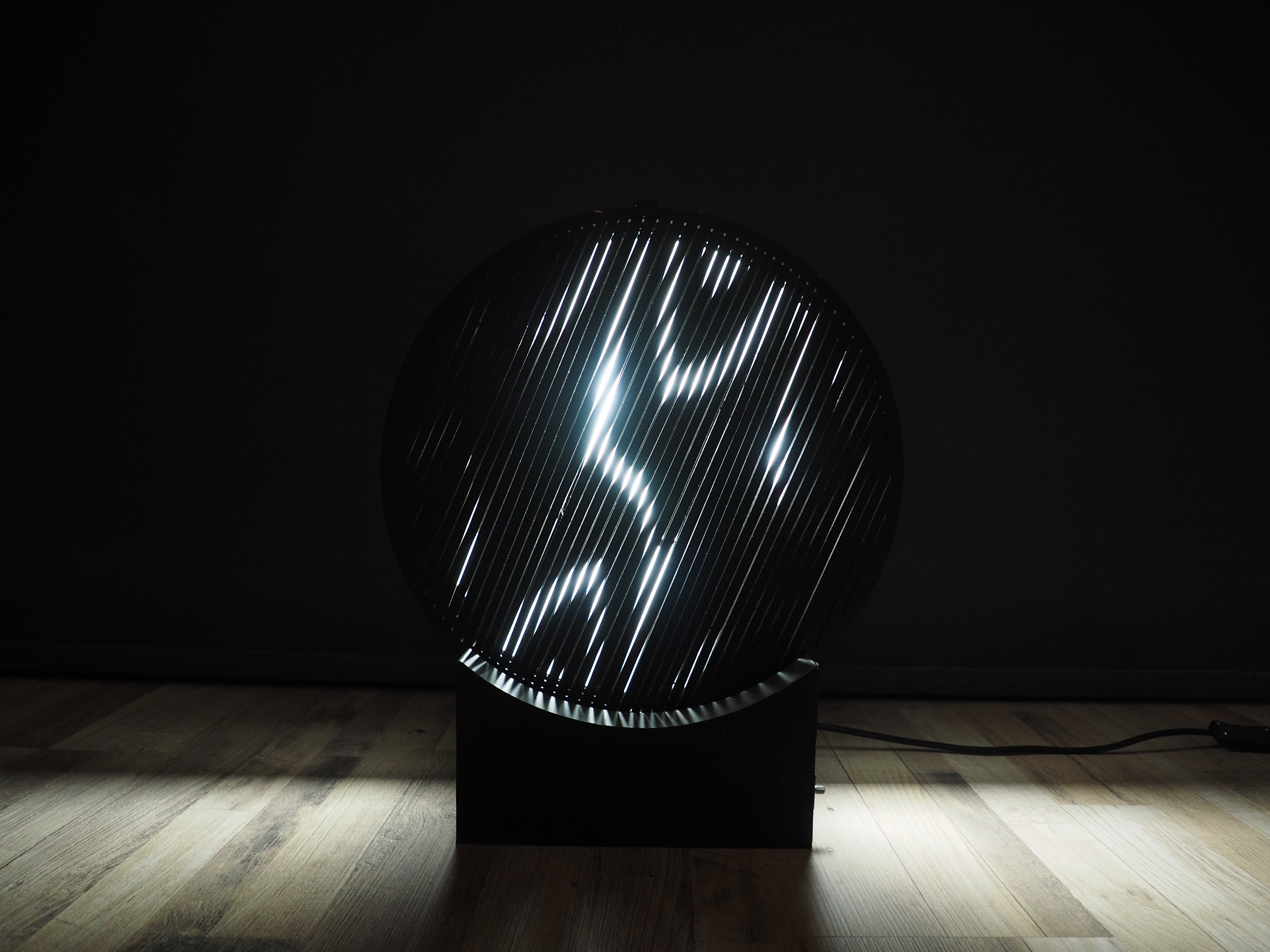 Dit hypnotizerende effect wilde ik ook bereiken met mijn lichtobject. Ik experimenteerde met verschillende patronen en bewegingen totdat ik iets vond wat me beviel: eenvoudige rechte lijnen die in tegenovergestelde richting ten opzichte van elkaar bewegen, waardoor een Moirépatroon ontstaat.