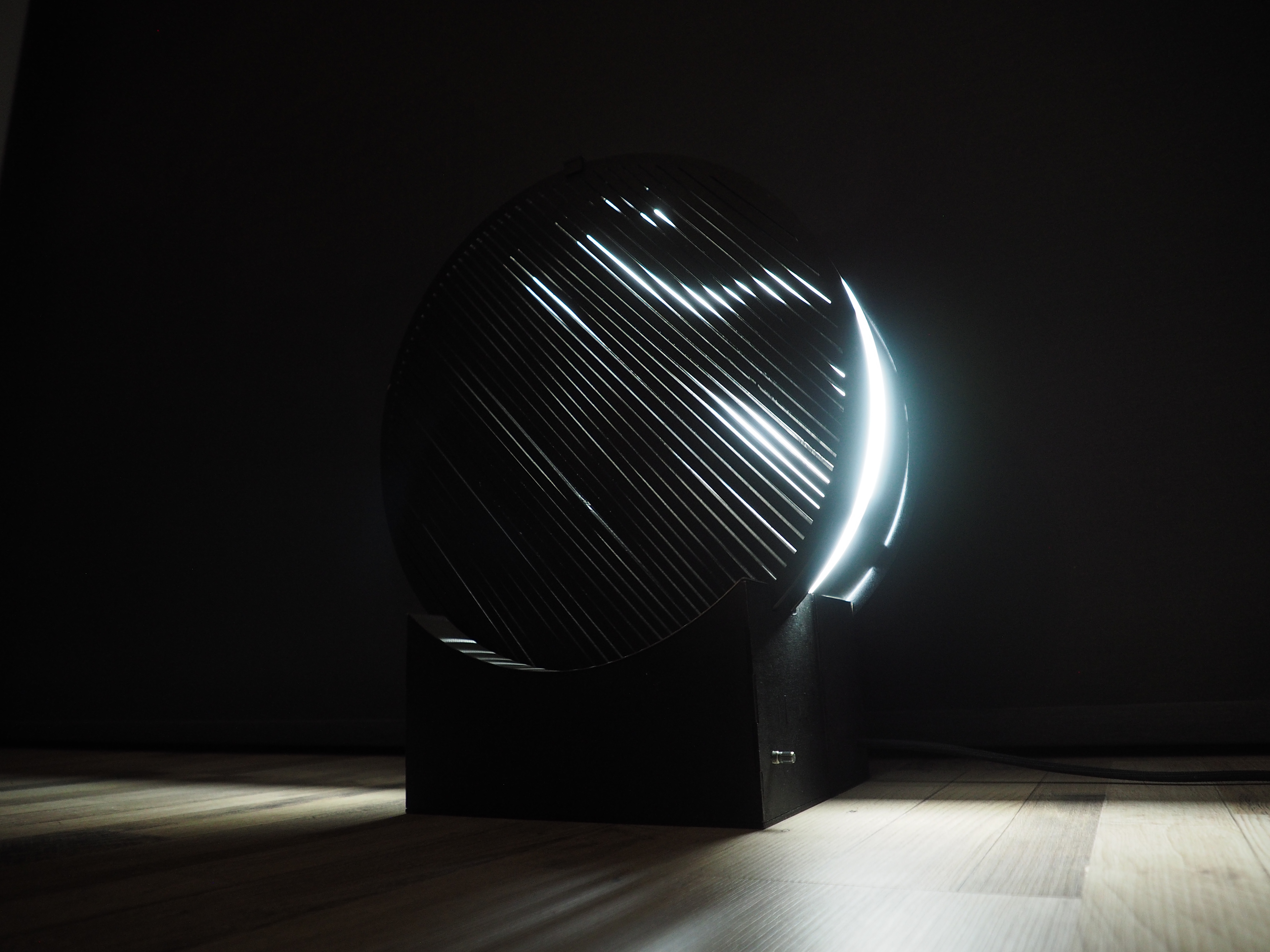 My inspiration for this light object came from the art exhibition "ZERO" at the Martin Gropius Bau in Berlin. These artist play with minimalistic shapes, movement and light. Especially Günther Uecker's work 'Kosmische Vision' was very compelling to me. As the five discs were spinning and the light and shadows moved I was almost hypnotized and I could stare at it for hours.